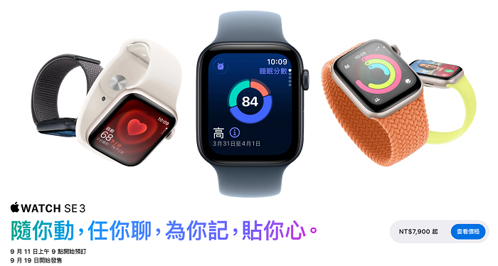 搭載S10處理器,支援5G網路,全時顯示螢幕首次登陸SE,無需喚醒螢幕就能查看時間,支援雙指互點兩下和翻轉手腕等直覺易用的手勢,全新手腕溫度感測功能,取得排卵日回推估計,生命徵象 App,持續跟測你的每日健康狀況,支援睡眠呼吸暫停提醒和睡眠評分功能,電池續航力正常使用時間最長可達 18 小時,SE首次支援快充,快充15分鐘可使用8小時。