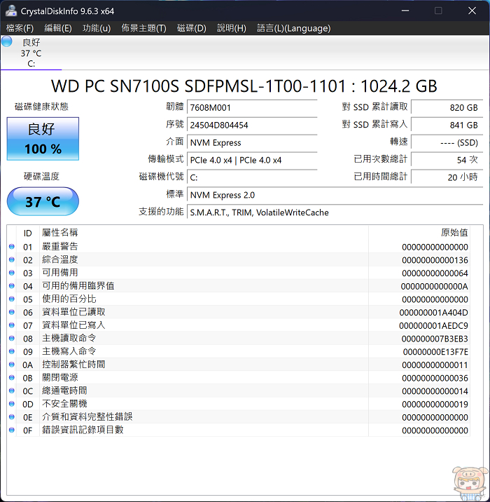 在CrystalDiskInfo C槽的資訊如下:WD PC SN7100S SDFPMSL-1T00-1101: 1024.2 GB,傳輸模式 PCIe 4.0×4 / PCIe 4.0×4 ,介面為 NVM Express 2.0,支援了S.M.A.R.T,TRIM,VolatileWriteCache。