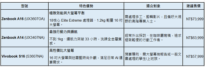 ASUS Zenbook A16系列台灣上市,攜手高通與微軟共同亮相,展現三方在AI筆電生態系上的深度整合,搭載Snapdragon® X2 Elite系列處理器,均具備 NPU 80 TOPS,雙倍 AI算力,效率全面進化,最新 Copilot+ PC帶來全新AI體驗,AI助理即時分析螢幕畫面並提供洞察與回答,讓工作/學習都能事半功倍,即日起至4月26日,購買Zenbook A16/ A14指定機種 (UX3607OA/UX3407NA),早鳥登錄送同款高科技陶瓷鋁合金精品滑鼠ASUS ZenMouse (價值NT$2,990)。
