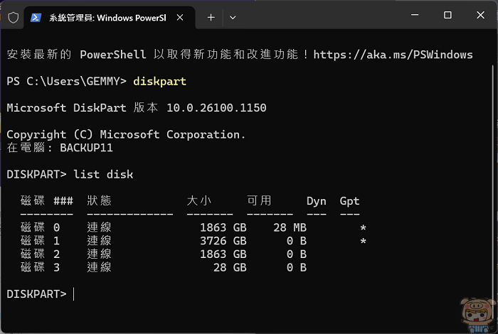 或是在CMD的模式下,來刪除裝置的寫入保護,以系統管理員執行CMD,接著輸入diskpart,然後再輸入list disk,然後….再然後…..哈,其實有點兒困難,如果對於電腦比較不熟悉,不知道會不會誤刪什麼🥺🥺🥺,還是別亂動的好!