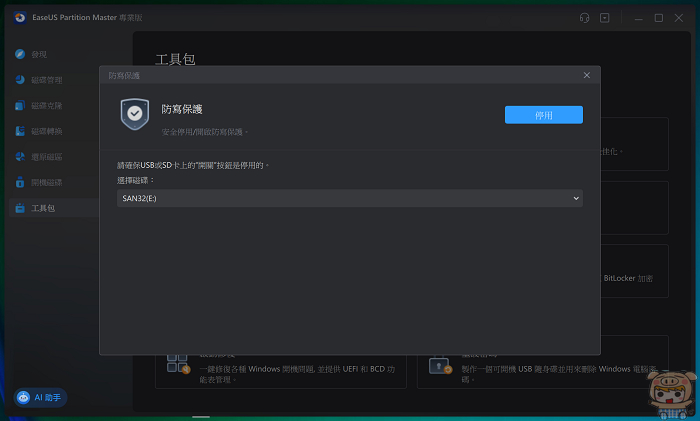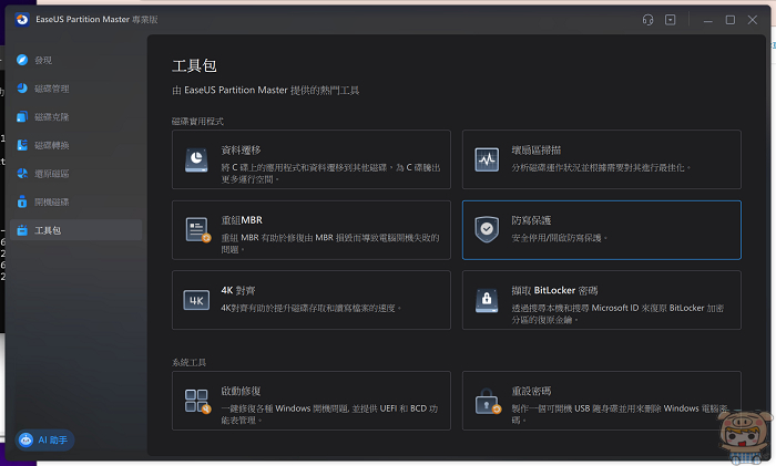進入EaseUS Partition Master之後,點選左邊「工具包」,這裡可以看到資料遷移、重組MBR、壞扇區掃描,擷取 BitLocker密碼等不少好用的功能,接著點選「防寫保護」。
