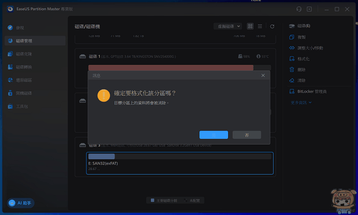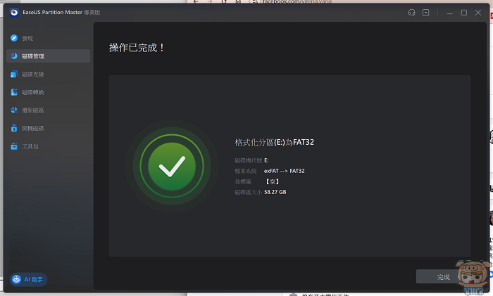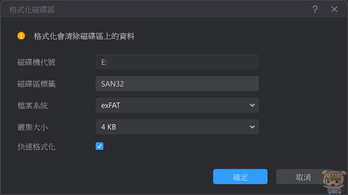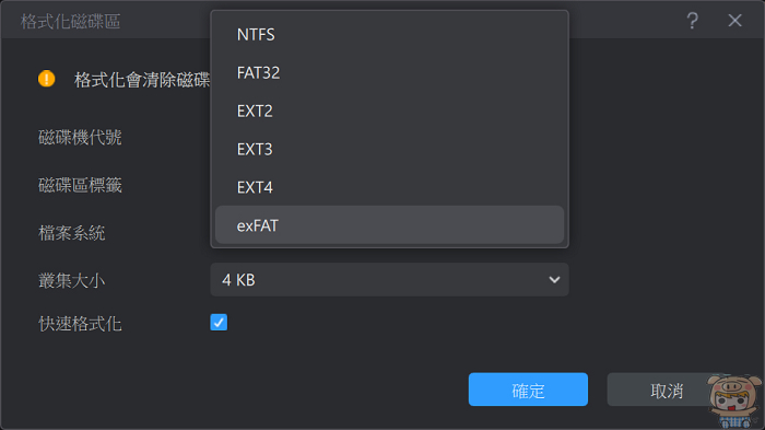 接著就能夠自由的選擇檔案系統的格式,無論是要NTFS、FAT32、exFAT、就能 EXT2、EXT3、EXT4也都沒有問題,選擇完成後,點選「確定」。最後當然就是執行格式化,這樣這張記憶卡就變成FAT32的檔式囉!