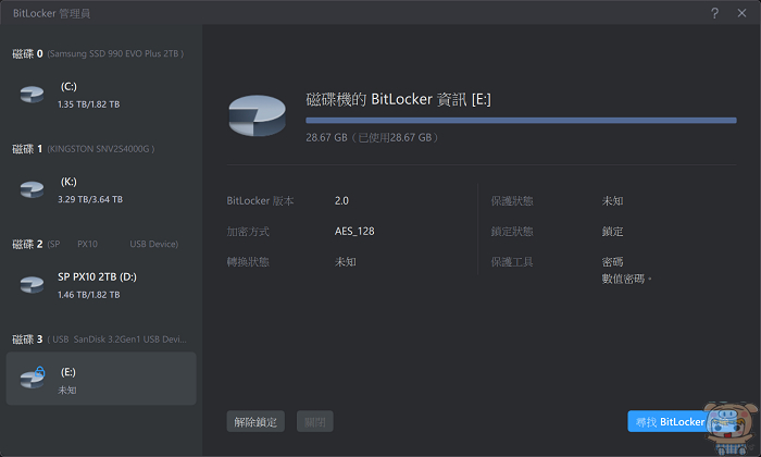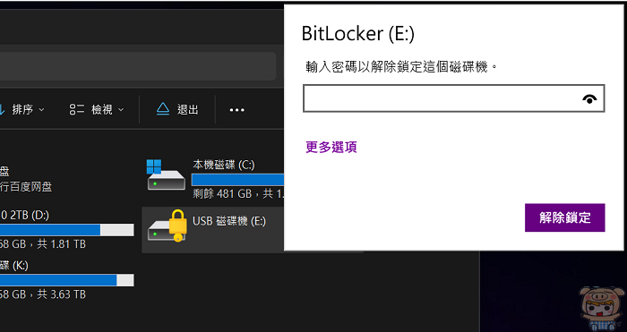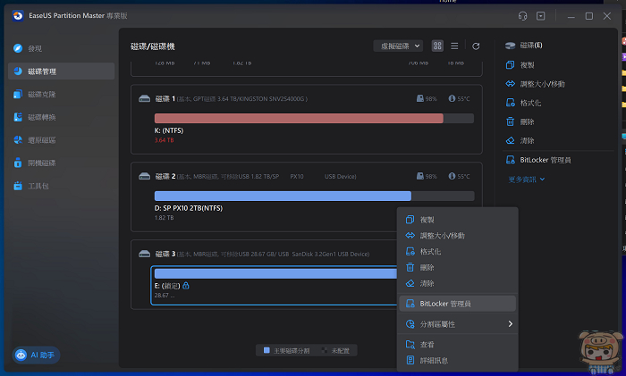 接著來看也是常見到BitLocker的部分,如果你的隨身碟插上去之後,需要輪入密碼才能解鎖,而您因為太久沒使用,早已忘記密碼,您可以透過Windows作業系統來解決,但像剛剛那樣比較麻煩,如果是透過EaseUS Partition Master,就能夠快速解決這個問題。