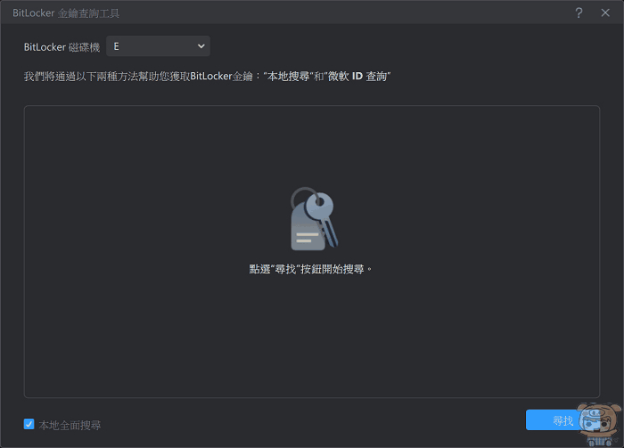 進入BitLocker管理員頁面之後,這裡提供了BitLocker版本、保護工具、保護狀態,磁碟機的資訊等,這個時候點選右下角的「尋找BitLocker金錀」。