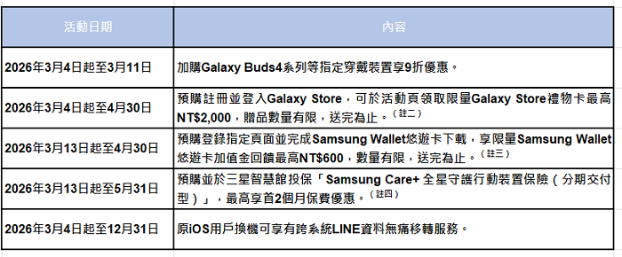 預購 Galaxy S26旗艦系列,除上述預購禮外,可享有 3月13日起優先領貨之權益。於預購取貨時間內完成取貨,即享以下優惠。