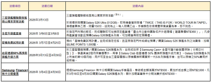於全台指定通路預購並於 4月14日前完成取機,購買 Galaxy S26 Ultra|S26+|S26 256GB,不加價享容量升級至512GB;購買 Galaxy S26 Ultra 512GB,加價NT$3,000享容量升級至 1TB。