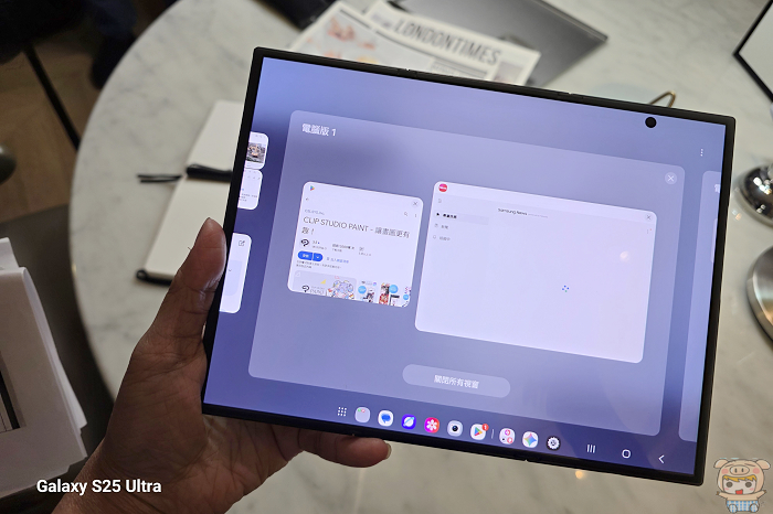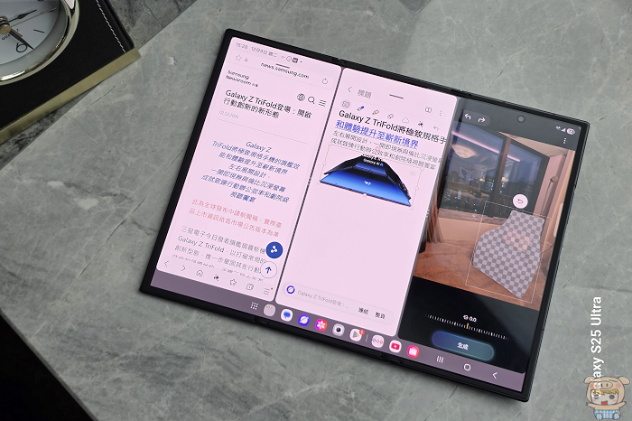 應用體驗上,展開後的 Galaxy Z TriFold 對需要多工處理或創作的使用者很方便,10 吋大螢幕可以同時開三個全尺寸 App,視窗大小可以自由調整,橫向模式能呈現三塊直立等比例畫面。
