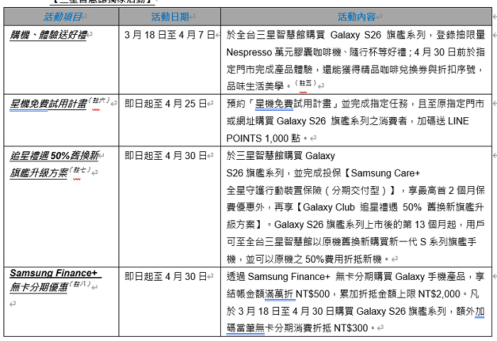 - 3月31日前Samsung Rewards享結帳金額2% Rewards點數回饋。