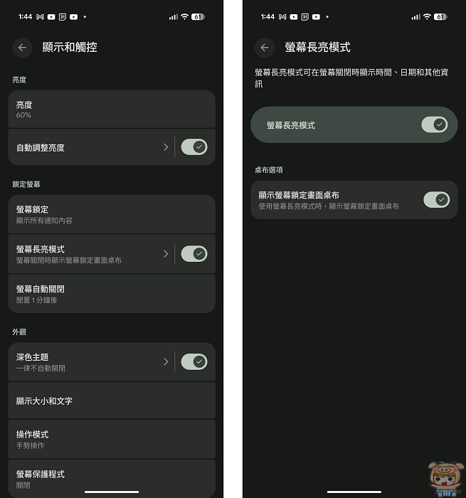 此功能可從「設定」→「顯示與觸控」→「螢幕長亮模式」,開啟「螢幕長亮」和「顯示鎖定螢幕桌布」即可啟動。