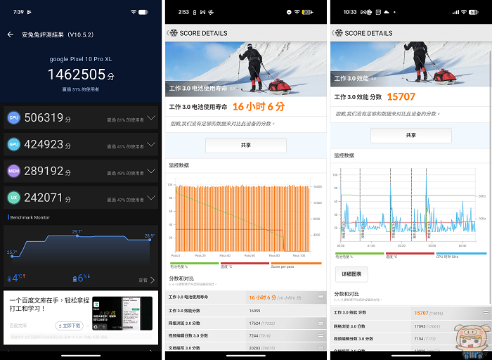 Pixel 10 系列皆搭載台積電 3 奈米製程的 Tensor G5 晶片,其中 Pixel 10 Pro XL 具備最高電池容量 5200mAh,並支援最高 25W Qi2 無線充電(同系列其他款為 15W),有線快充為 45W,充電系統搭載多層安全防護機制,且手機享有長達七年的作業系統和安全更新,安兔兔跑分分數頗亮眼,PCmark 續航則達到 16 hrs 以上。