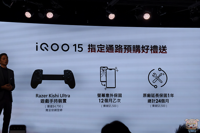 即日起至 12月5 日於 vivo全台官方體驗店、線上官方商城、指定電商通路及燦坤、GAME 休閒館、宏碁遊戲官方線上商店等指定合作通路開始預購。凡於預購期間入手 iQOO 15,即享原廠延長保固一年,並至官網登錄完成即可獲得超人氣 Razer Kishi Ultra 遊戲手持裝置,以及螢幕意外保固12個月乙次等重磅好禮,整體預購禮總價值13,790 元。