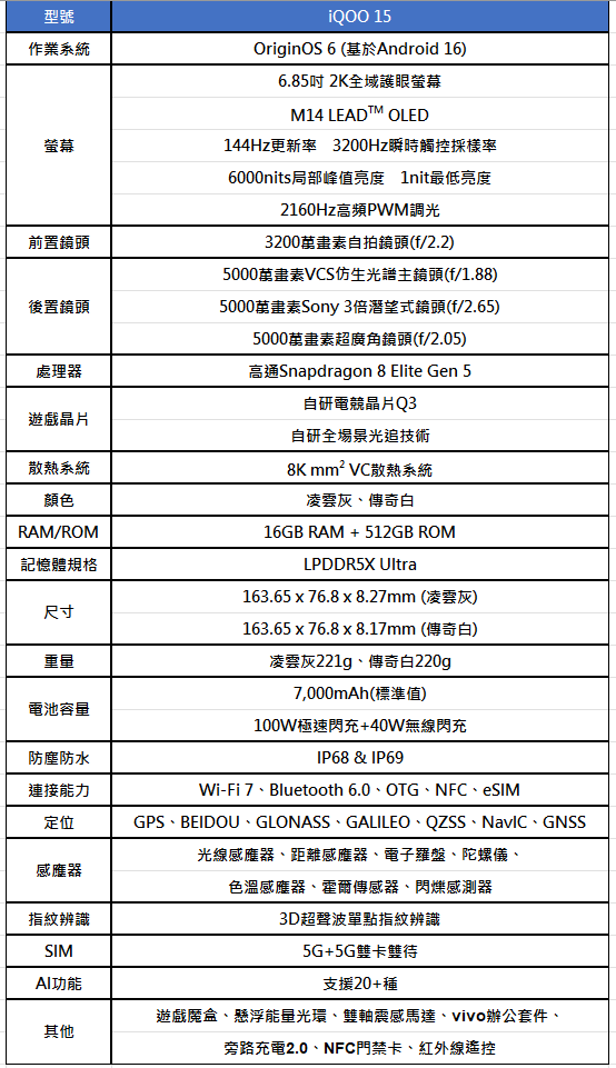 iQOO 15 售價NT$29,999元(16GB RAM+ 512GB ROM),提供「凌雲灰」、「傳奇白」兩色選擇,即日起至12月5日,凡於指定通路預購 iQOO 15,至官網登錄完成即可獲得超人氣 Razer Kishi Ultra 遊戲手持裝置;預購期間持 ASUS ROG 手機至全台官方體驗店賞機並完成預購 iQOO 15,加碼再送 vivo 筆電隨行袋乙個!
