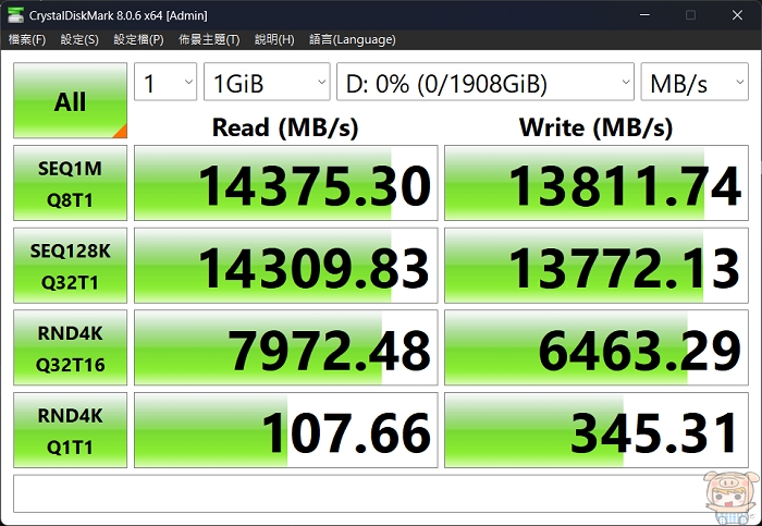 使用CrystalDiskMark 8.0.6 測試,分數如下:讀取速度為14375.30MB/s 、寫入速度為13811.74MB/s, 讀取與寫入速度都有接近官網所標示的速度!比原本PCIe 4.0 7000MB/s 的讀寫快了一倍!!如果有需要更多的測試,其實網路上有不少數據,小米就不再多測試啦!