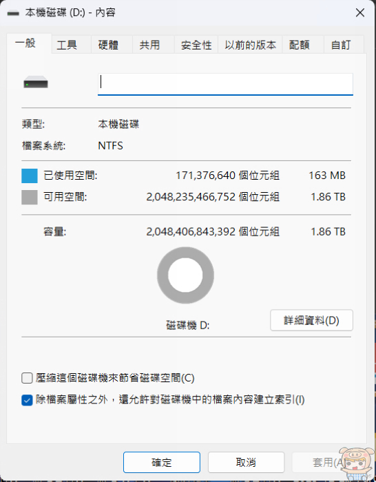 開完機之後,本機磁碟上的資訊裡,可以看可用空間1.86TB,好大的空間呀,看了就很開心!可以隨便亂丟檔案了🤣🤣🤣。