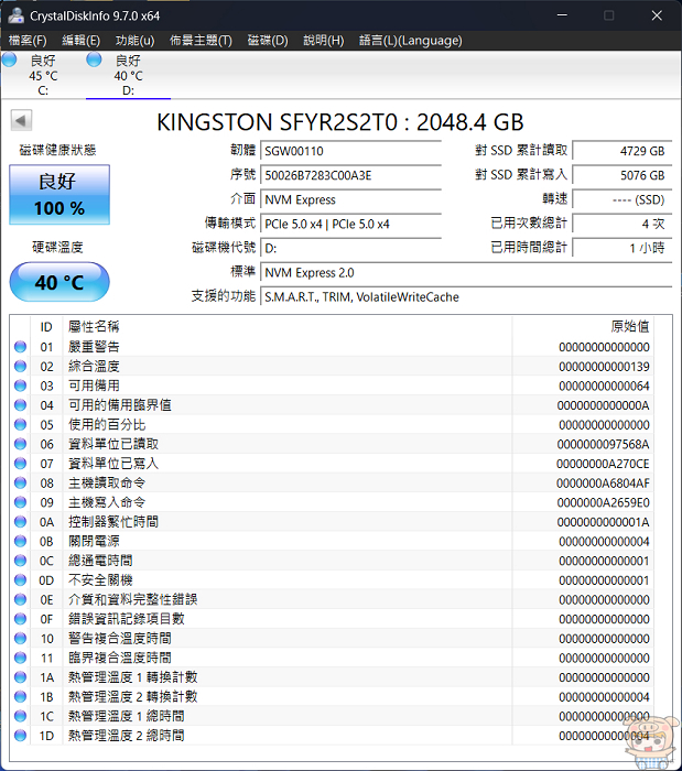 在CrystalDiskInfo 資訊如下:KINGSTON SFYR2S2T0:2048.4 GB,介面為 NVM Express,傳輸模式為PCIe 5.0 x4 , 支援了S.M.A.R.T、TRIM、VolatileWriteCache。