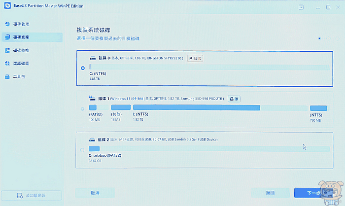 接著小米就要來把原本舊的SSD資料完全移植到金士頓 FURY Renegade G5上去,小米最近比較常用的磁碟複製的軟體是 EaseUS Partition Master,因為他提供使用者建立隨身碟開機模式,所以開完機後,選擇來源與目的,就開始進行克隆了,大約1.5TB的資料量,約不到半小時左右完成,也是相當的快。