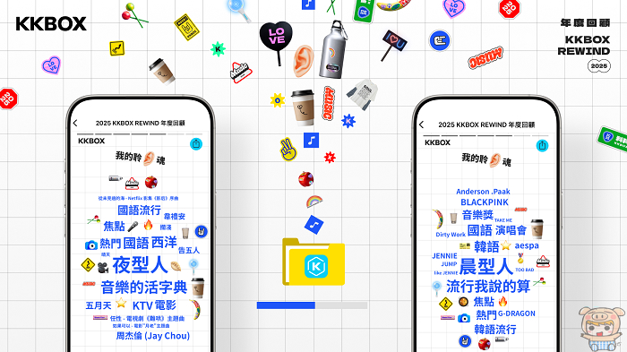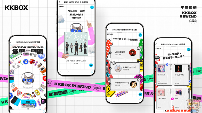 KKBOX 今(24)日正式推出「KKBOX REWIND 2025」年度回顧,以「剪貼簿」概念結合全新功能,結合追星小物、音樂與日常生活元素,將聆聽數據化為一頁頁時尚拼貼風「音樂生活日誌」,陪用戶從第一首歌、四季熱播單曲,到 5 大喜愛歌曲及 3 大本命歌手,重溫過去一年的音樂足跡,此外週年慶活動也正熱烈進行中,多款優惠年繳方案限時登場,陪伴用戶用最甜價格聽進 2026。