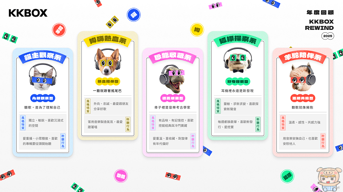 以多種動物角色趣味對應不同聆聽個性與音樂品味,包含貓主觀察系、狗嗨熱血系、恐龍收藏系、狐獴探索系與羊駝陪伴系五大類型。用戶可挑選風格最符合的頭像開啟年度回顧之旅,展現屬於自己的獨特「音樂人格」。