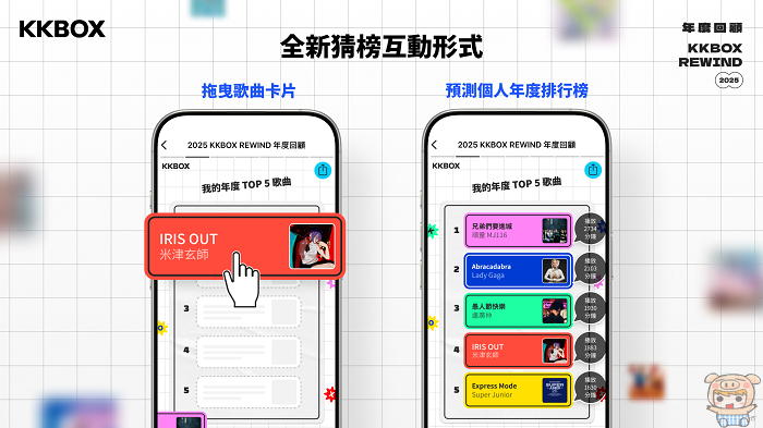 新增互動形式,用戶可在「我的年度 TOP 5 歌曲」環節中自行拖曳前 5 名歌曲卡片,猜測個人年度愛歌排行榜順序,最後再由系統根據聆聽數據揭曉實際歌曲排名。