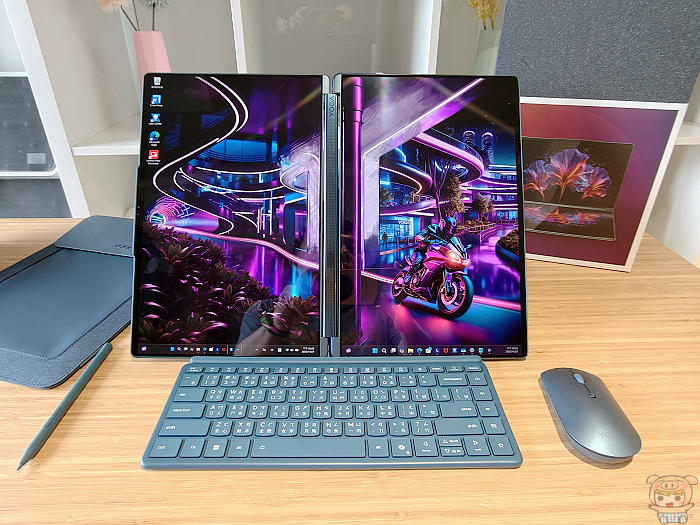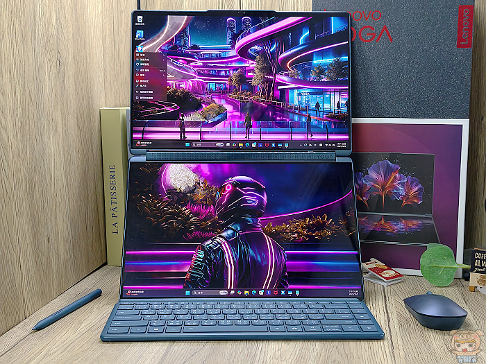哈哈。螢幕一上一下,這樣雙創作的模式放法真的很猛,當然你也可以左右開攻,放橫的雙閱讀模式,就像是一樣書一樣,左右各一頁,這樣畫面就不會那麼高了,像小米平常用雙螢幕時,習慣左邊開參考資料,右邊開啟工作頁面,Yoga Book 9各種用法,隨你自由搭配。