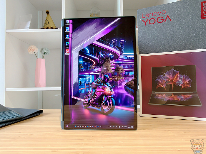 Yoga Book 9 肯定當然有支援觸控囉,所以就變成一台超大的平板,哈,沒看過這麼大台的平板吧,不過這樣實在太大了,把它對折後,就和一般翻轉筆電一樣的使用方式囉!躺在沙發上看影片,或是逛逛購物平台,一整個舒爽🤣。