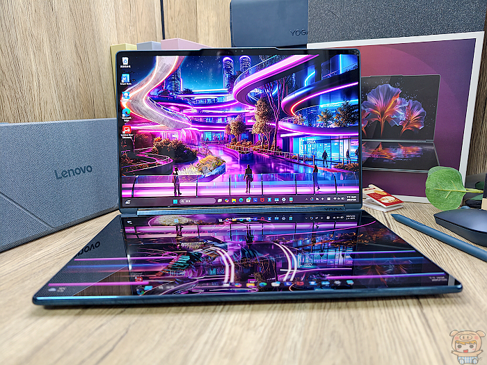 相信大家從上面看下來,應該覺得它的螢幕超美的,而且還是一次兩個螢幕,有夠美的,Yoga Book 9 配置 2個 14吋 2.8K PureSight Pro OLED 螢幕,2880×1800 高解析度,同時還有TÜV低藍光護眼認證與Eyesafe®。