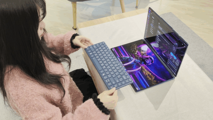 當然….如果您連鍵盤也不想帶,那也沒關系,Yoga Book 9 的大螢幕,直接變出一個完整的虛擬鍵盤加上觸控板,打字一樣方便,不過剛開始需要一些時間適應就是了!