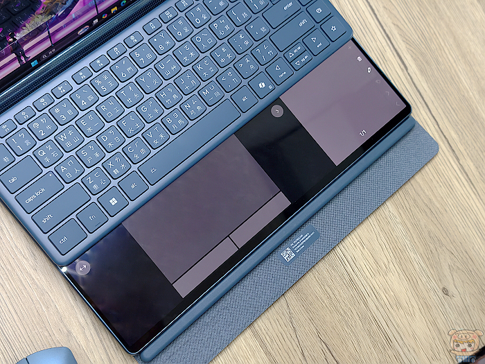 還有更神奇的事…..那就是~~~當我們把鍵盤直接放到第二個畫面時,畫面上就神奇現觸控版啦,超帥的啦,而且觸控板還可以移到旁邊去,多出一個記事框,讓您隨手筆記,這樣出門連滑鼠也不用帶。