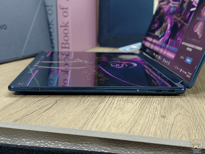 Yoga Book 9 機身的左側右側共有三個USB 4.0 Type-C (Thunderbolt 4)埠,支援 USB PD 3.0 充電與 DisplayPort 2.1 視訊輸出、電源鍵(含指示燈),也就是說,隨便哪一個埠都可以充電,超方便的😍。