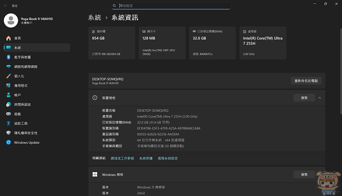 接著來軟體系統的部分,從電腦的基本資訊來看內建最新的 Windows 11 專業版本的作業系統!配置 Intel® Core™ Ultra 7 255hV處理器 @2.00GHz 、32GB 記憶體,支援10點觸控!