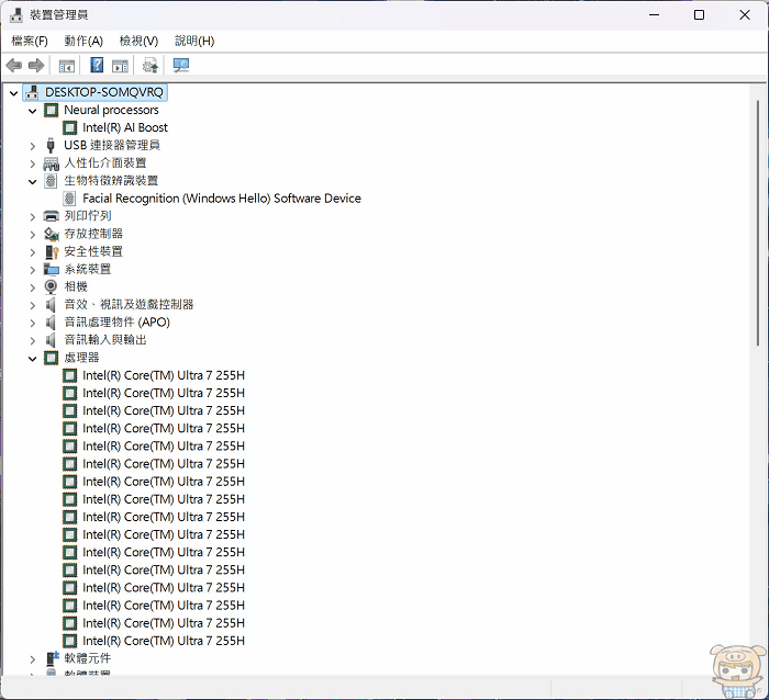 處理器為Intel® Core™ Ultra 7 255H,內建顯示為為Intel® Arc® 140T GPU (16GB),網卡採用Intel(R) Wi-Fi 7 BE201 高速網卡,支援最新的Wi-Fi 7,最新一代的無線網路,比Wi-Fi 6E 快4.2倍,延遲更是降低了4倍,大家有發現最上面還有一個Intel(R) AI Boost嗎?只有最新的才含有AI引擎的NPU哦。