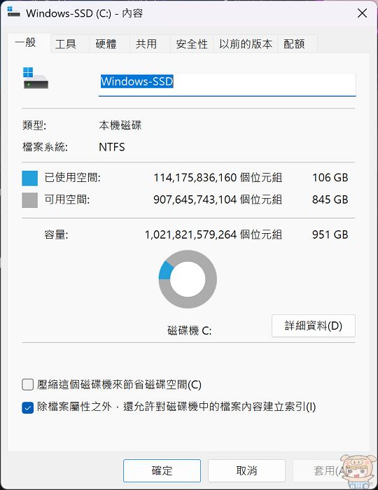 硬碟容量的部分採用了快速的PCIe M.2 SSD固態硬碟,總容量有951GB ,扣除安裝系統以及還原系統,還有845GB 可以使用!