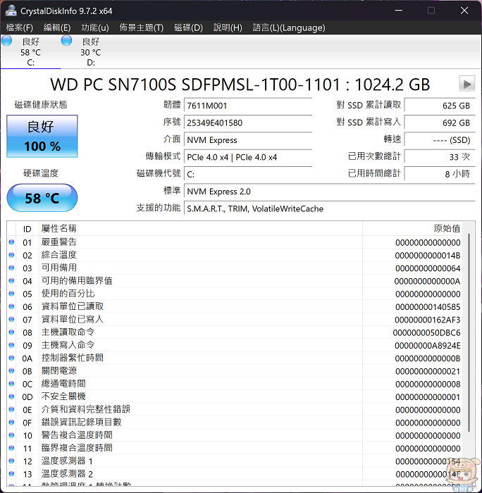在CrystalDiskInfo C槽的資訊如下:WD PC SN7100S SDFPMSL-1T00-1101: 1024.2 GB,傳輸模式 PCIe 4.0×4 / PCIe 4.0×4 ,介面為 NVM Express,支援了S.M.A.R.T,TRIM,VolatileWriteCache。