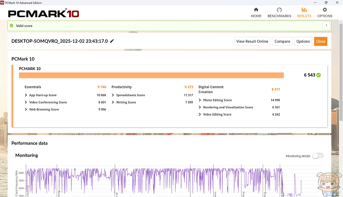 PCMark 針對筆電的測試,所獲得 6543 分,Essentials 為9746分,Productivity 為 9273分,Digital Content Creation 為8411分。