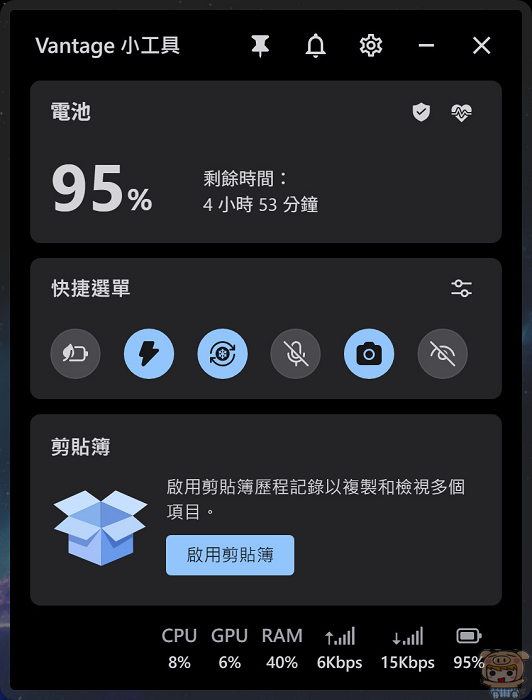 好用的Vantage 小工具,裡面有快捷選單,提供了一些常用的選項開關,像是關閉相機、麥克風,另外也顯示了電池、CPU、GPU、RAM等資訊,讓您直接知道筆電的使用情況!