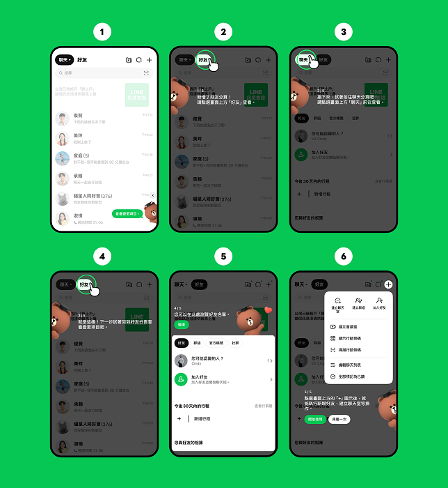 三、 右上角「+」按鍵集結常用功能:像是加入好友、建立聊天室、全部標記為已讀等等的聊天常用功能,都收納在這裡。