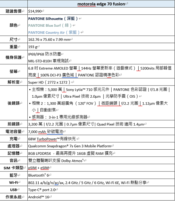 edge 70 fusion 新機提供三款 PANTONE 認證配色,建議售價$14,990,搭載 7000mAh 矽碳電池、精準顯色與軍規防護,主打全面升級體驗。Motorola 同步攜手各大電信通路推出購機方案,指定專案價手機只要 $0 元起。3 月 23 日至 31 日間,於線上官方平台與三創 Lounge 門市進行預購,即贈限量 moto 125W 原廠快充組(價值$2,190)。