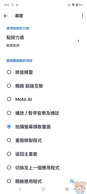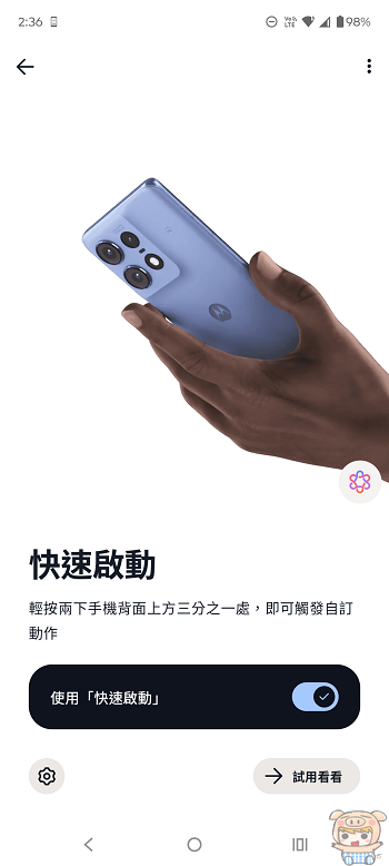還有很推薦的這項隱藏功能,那就是「敲敲背蓋」快速啟動,可指定項目透過電源鍵雙擊或背蓋輕敲快速啟動,不過目前僅能選擇一種,未來若能開放更多敲擊功能,應用上會更有互動感。