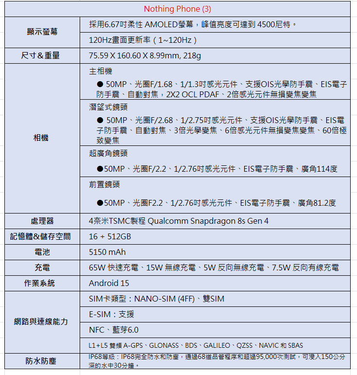 Phone (3) 目前採用 Android 15 與 Nothing OS 3.5系統。Android 16 與 OS 4.0 將於 2025 年第三季推出。 Nothing 提供 5 年主要 Android 更新及 7 年安全性更新。