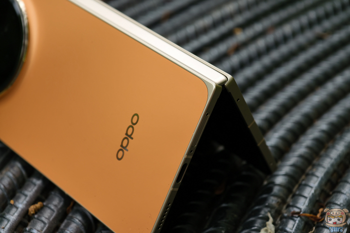 內螢幕展開之後,增高的邊框比前幾代更平整,粗框感明顯少很多,整體視覺更乾淨。展開打平後厚度來到 4.21mm,整機重量約 225g,不只比上代更輕盈,耐用強度也同步提升。特別是 OPPO Find N6 的橙色版本,側邊轉軸採用真金鍍膜的鈦合金中框,拿在手上會有高級大人專屬的質感與氣場。