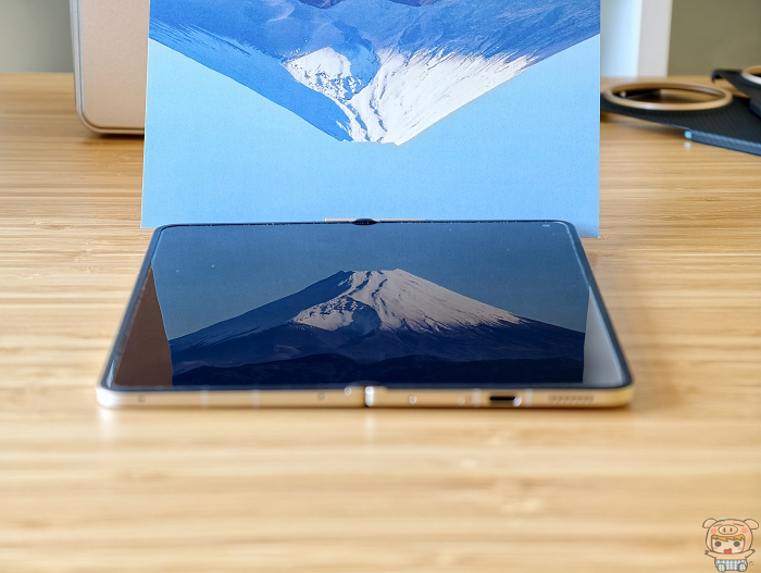 對於摺痕非常介意的! 看完這一輪虐機實測,應該會明顯感受到它在視覺與耐用性上的進化,內螢幕最後快速帶一下規格,這塊 QXGA+ AMOLED 面板支援 10 億色顯示,內外螢幕皆支援 120Hz 自適應更新率,峰值亮度最高達 2500nit,並覆蓋 100% DCI-P3 色域;內頁前鏡頭為 2000 萬畫素(f/2.4)。