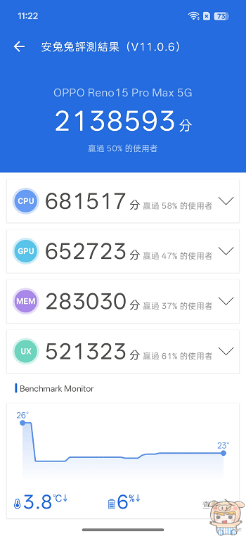 OPPO Reno15 Pro Max 與 Reno15 Pro 的跑分表現本來就不差,但實際用起來,更有感的不是帳面數字,而是系統、低功耗、溫控等掌控力順不順,透過 第 6 代 NPU 880 與 Imagiq 1080 ISP 相輔加乘,不論是生成圖片、去摩爾紋、高畫素裁切等演算,手機都能快速完成,日常使用時,系統也會慢慢記住你的操作習慣,滑網頁、切換多款 App 不會卡頓,下方提供安兔兔及 PCmark 跑分參考。