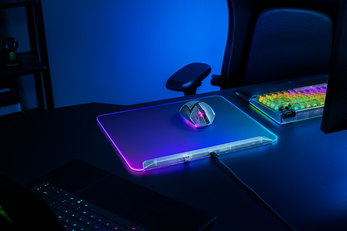 全球首款全區域 RGB 光效滑鼠墊,以半透明上層設計重現電路細節,為桌面增添獨特光影與科技質感。