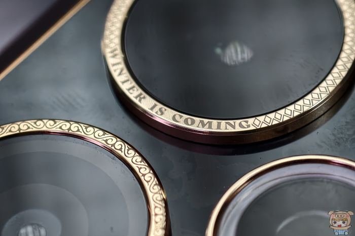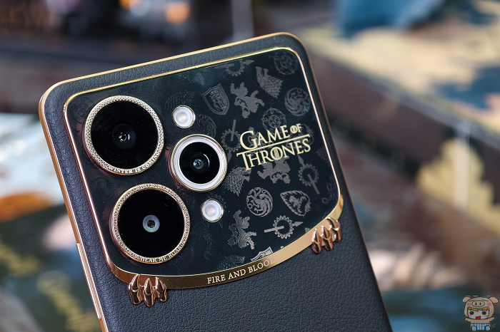 鏡頭邊框刻有「WINTER IS COMING」與「HEAR ME ROAR」金色字樣;鏡頭模組外圈印有「FIRE AND BLOOD」並以浮雕龍爪與家族徽章點綴,體現冰與火共存的力量美學。