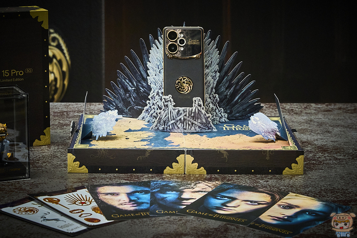 限量版典藏禮盒則以維斯特洛地圖與龍蛋木箱為設計靈感,內含鐵王座造型手機座、國王之手SIM卡針、秘密信函、專屬明信片與貼紙套組,開箱瞬間即刻沉浸於權力遊戲的史詩氛圍。