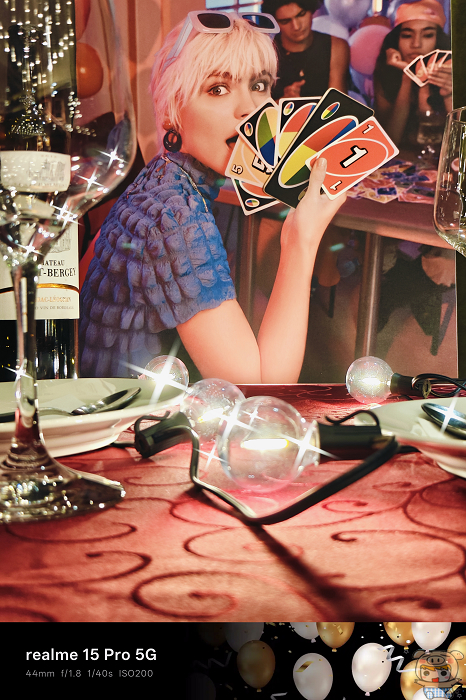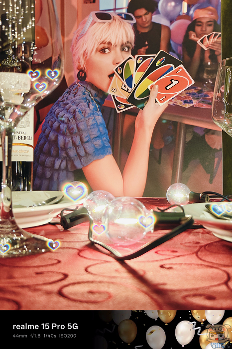 AI 派對模式則專為夜晚派對環境優化,能自動偵測臉部膚色、提升低光亮度,並加入動態光效處理,讓使用者在閃爍燈光中依然成為畫面焦點,建議在背景有點小光源的場景拍攝,星芒和炫彩愛心效果會更好。