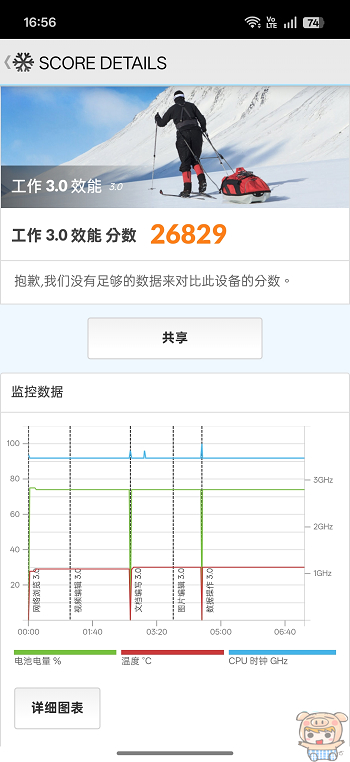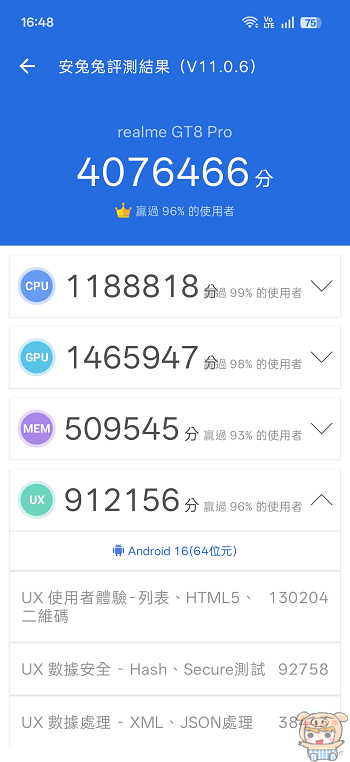 另外,透過第三代 Oryon CPU旗艦架構(2 顆超大核+6 顆性能核),與上代相比,CPU 和 GPU 分別有 20%、23% 的提升,搭配 LPDDR5X 記憶體、UFS 4.0 儲存,及最高可擴充到 16GB+12GB 的動態 RAM,進入大型遊戲、大地圖或載入角色等資源速度也是很快,對於講求效率、沒耐心? 的現代人來說,這效能是絕對能滿足,而且 APP 頻繁切換都依然順暢不卡頓,續航能力也很優異,提供安兔兔和 PCmark跑分參考。