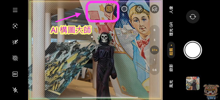 應該大家都有遇過,某些場景怎麼拍都不理想,試用相機新增的「AI 構圖大師」,智慧取景跟我平常會抓的構圖差不多(要失業了嗎? 哈哈),這操作非常非常簡單,只要輕點一下介面裡的「方格圖示」,系統會智慧分析畫面並自動切換適合的拍攝焦段,你只要按下快門即可,不過這也是參考啦,老話一句,自己喜歡最重要。