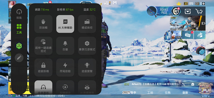 遊戲工具箱內的輔助功能更多了,包括低功耗、均衡、GT 模式 等多種選擇,同時對應部分遊戲,分別支援 AI產生回覆、精彩時刻、音效增強、4D 震感等玩法,加上原本的 AI 妙感觸控、AI 體感操控、旁路充電與背景零干擾,遊玩體驗更貼近人機一體的感受。