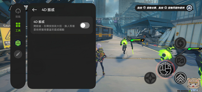 最新的 4D震感目前僅支援絕區零、崩壞,透過 0816 X 軸線性馬達和雙 1115e 立體聲揚聲器,在釋放大招或切換角色等場景,能同時帶來非常有感的手感、音效和震動反饋,臨場感指數的確加滿。